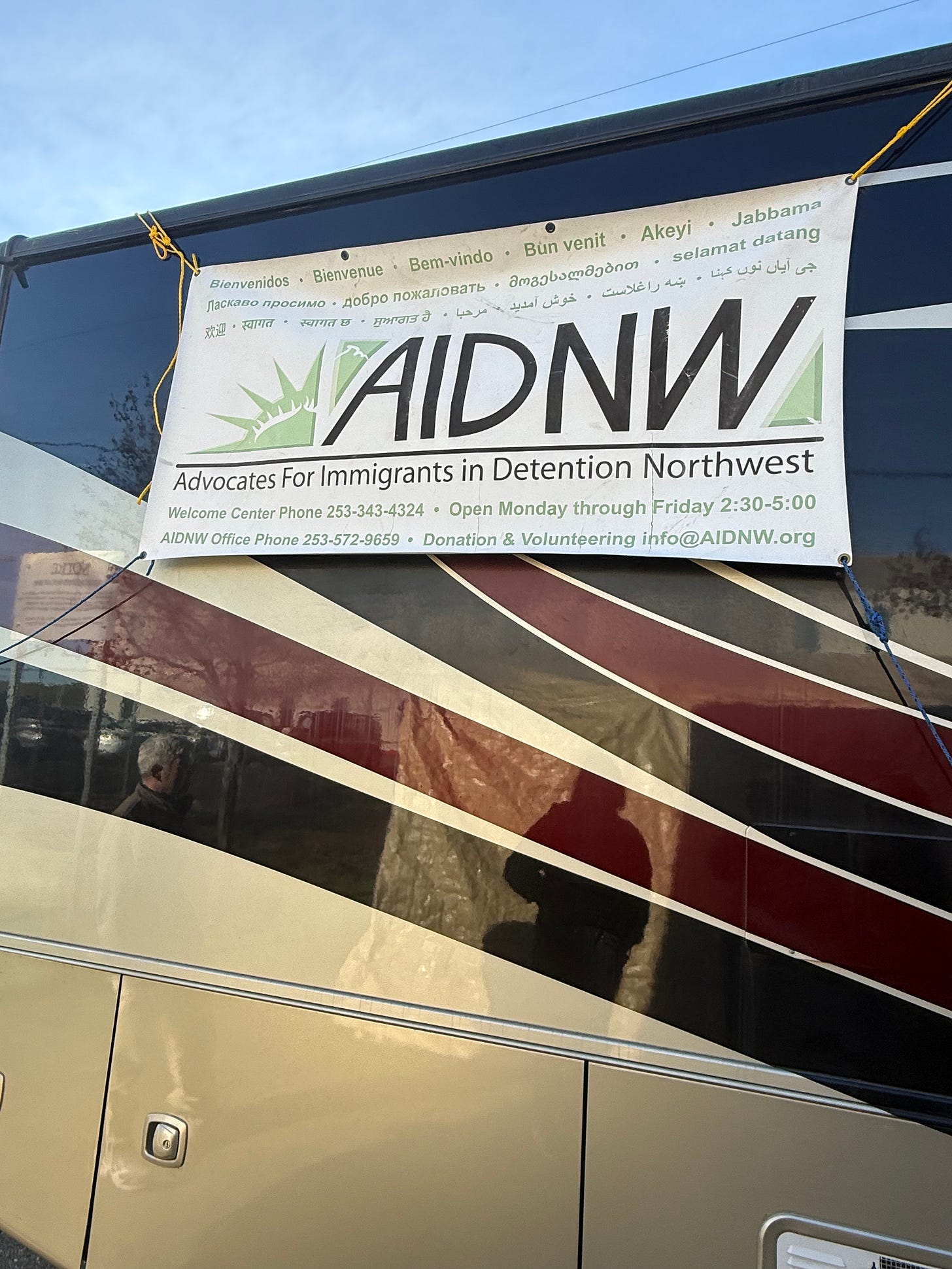 Every afternoon from Monday through Friday, volunteers from AIDNW (Advocates for Immigrants in Detention Northwest) wait to welcome and help released detainees. There are between 2 and 10 people released from detention on any given day. AIDNW has tents set up by the gates and an RV parked nearby, ready to provide people with clothes, backpacks, phone and internet access, and hot coffee. Volunteers are also on hand to drive people to the bus station or airport.
